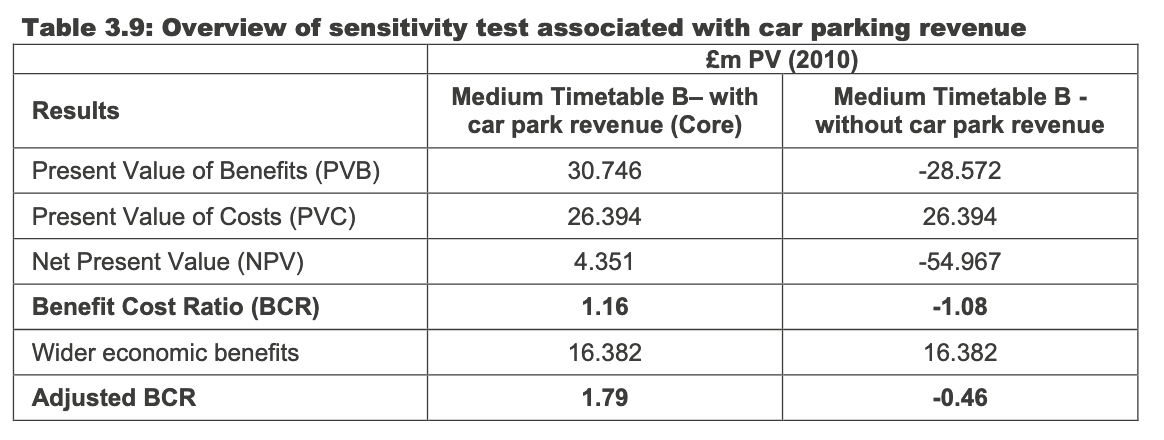 The table below from the business case shows this clearly: the ‘core’ BCR on the left appears marginally positive only by counting parking revenues as benefits—a treatment inconsistent with TAG. The sensitivity test on the right, which removes parking revenues, reveals negative value for money from a welfare economics perspective.