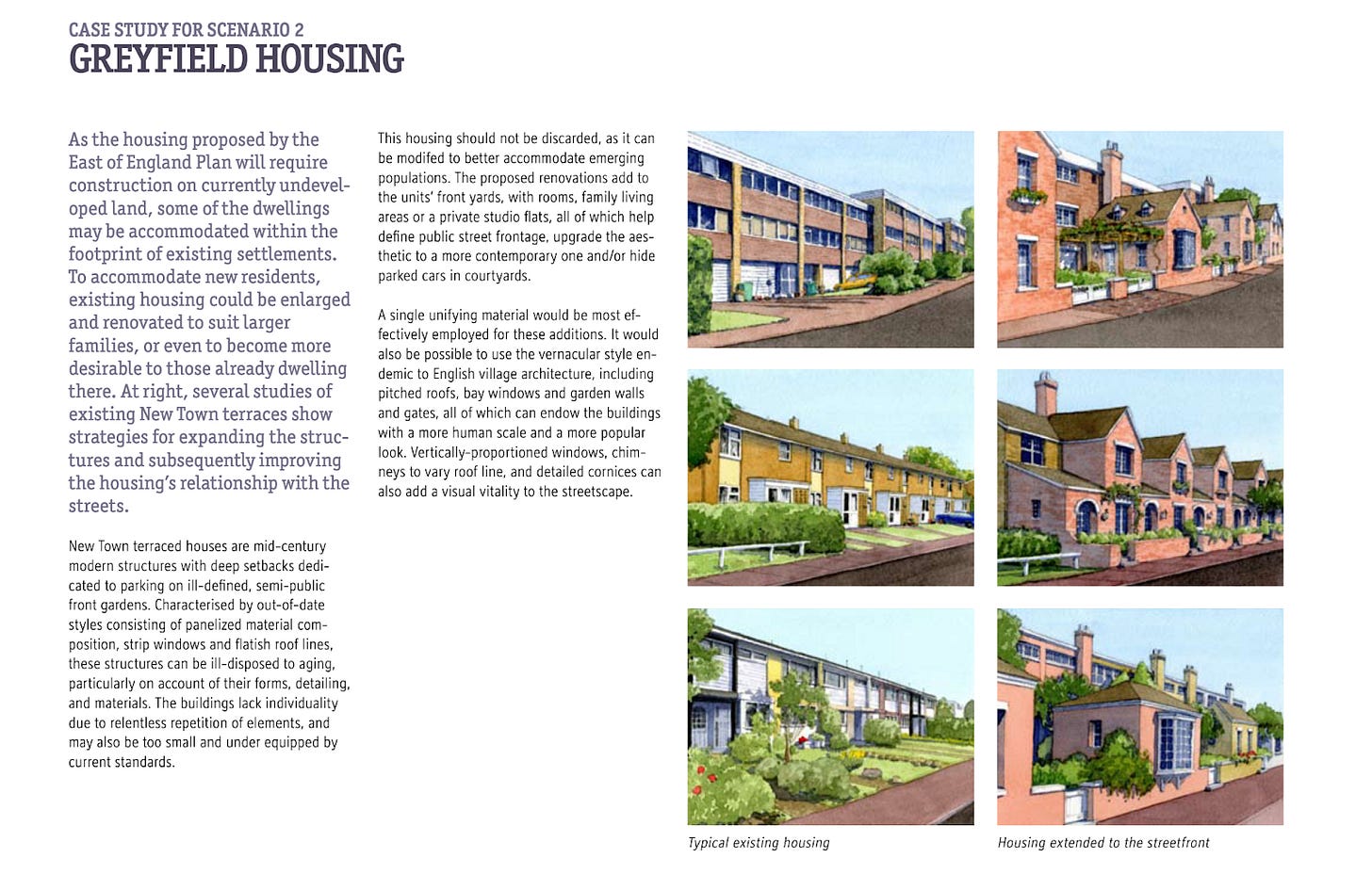 The 2008 Hertfordshire Guide to Growth, authored by Andres Duany (founder of the Congress for New Urbanism) with academic and local partners, outlines methods for intensifying existing built-up areas. Beyond developing car parks and underused industrial estates, the guide explores options to extend existing houses, adding more space and potentially more units. Delivering these interventions requires active, coordinated planning - precisely the capacity that Local Planning Authorities typically lack.